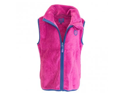Dětská propínací chlupatá vesta v tmavě modré barvě. Stojací límec, dvě kapsy, barevné kontrastní lemy.